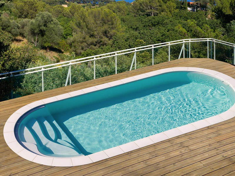 De verfijnde vormen van het ovale zwembad type Lisa passen zich perfect aan aan uw tuin. De Pacio trap past perfect in de rondingen van het zwembad.